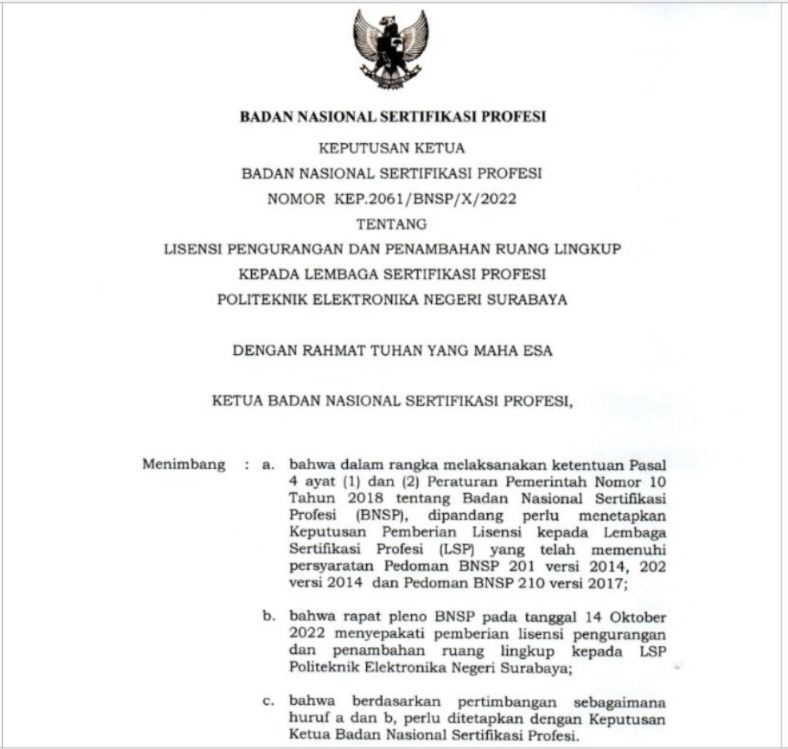 Keputusan Ketua BNSP Nomor KEP.2061/BNSP/X/2022