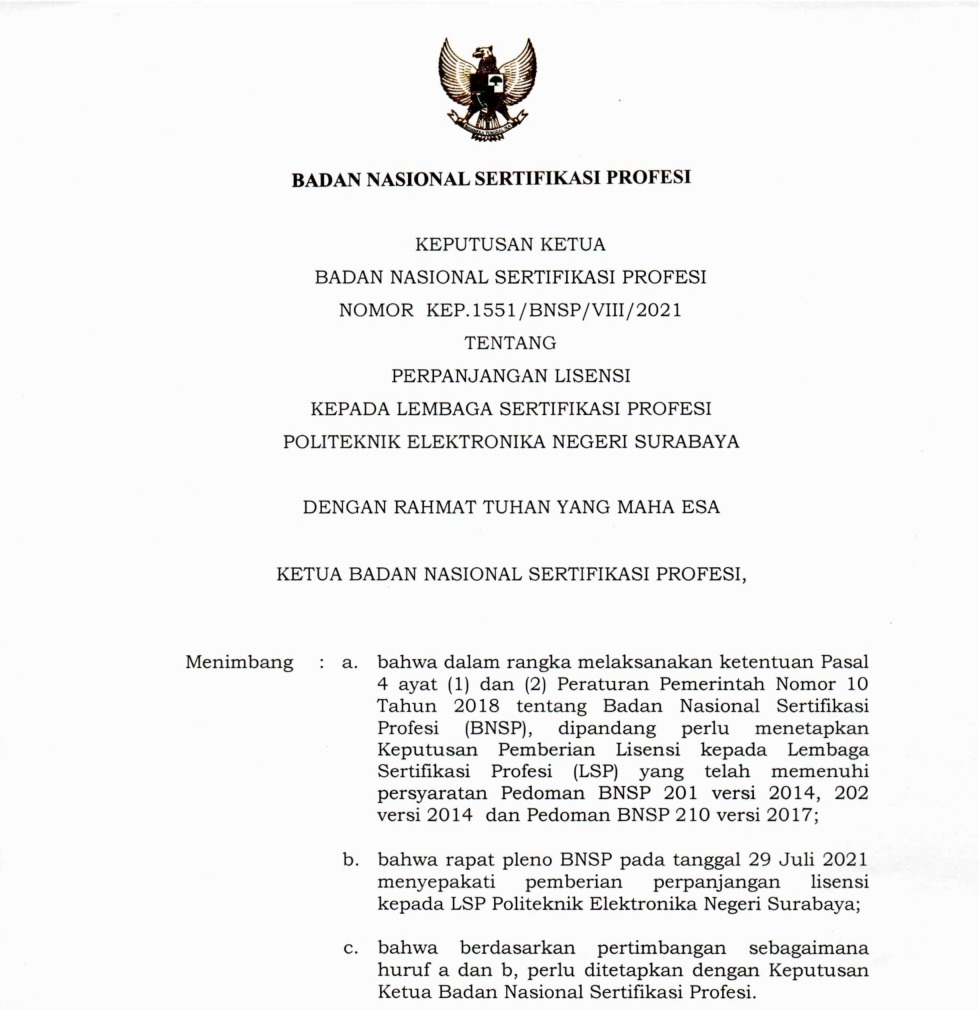 Keputusan Ketua BNSP Nomor KEP.1551/BNSP/VIII/2021